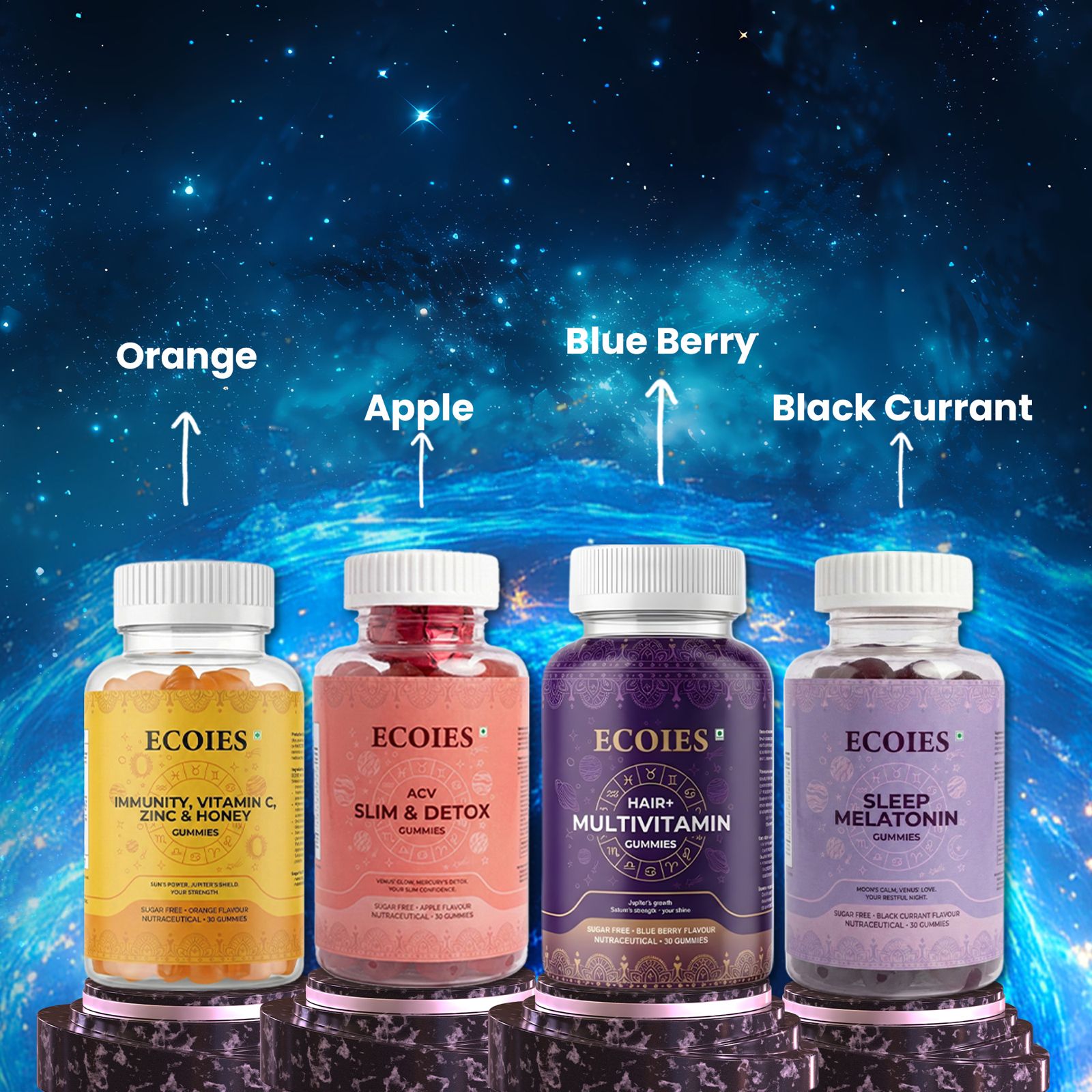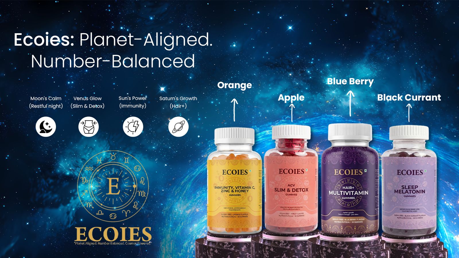 ECOIES = Wellness Aligned with Astrology + Numerology + Cosmic Energy (ANC). A next-generation wellness brand where every formulation, ingredient, design element, and number resonates with planetary forces, numerical harmony, and cosmic balance.Ecoies was born with a vision: to bring ancient cosmic wisdom into everyday wellness. Inspired by India’s Vedic sciences and backed by modern research, we create products that resonate with your energy field and deliver visible results.